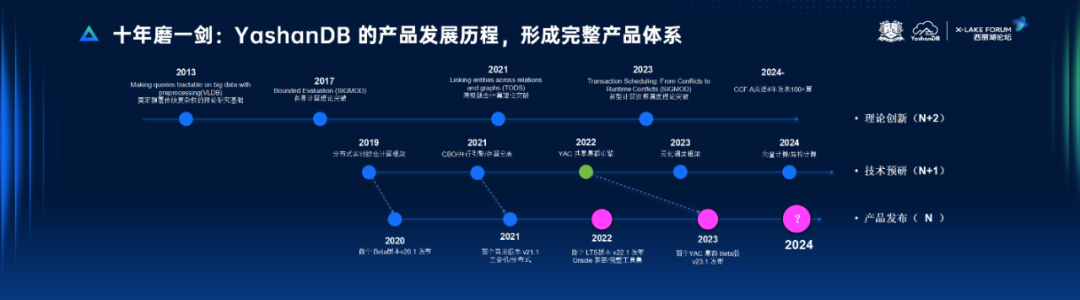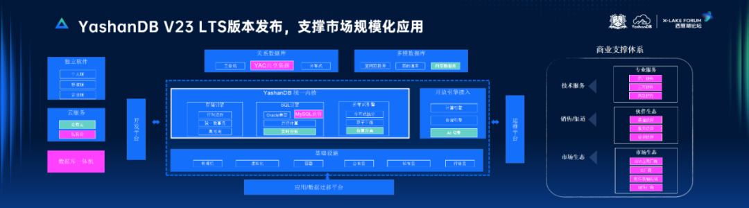 崖山给出了自己的探索和答案,这张图是崖山产品能力规划的全景图,蓝色部分是崖山当前已经具备的产品形态,我们构建了统一内核、主备和分布式产品形态,已经发布了相关的版本。在YashanDB V23版本中,面对刚才提及的挑战和问题,我们正式发布了YAC共享集群、MySQL生态兼容、私有云管平台和数据库一体机,为用户提供面向未来大规模应用的能力。在产品能力持续演进的同时,我们也同步构建了市场、渠道、生态等能力,确保对用户提供从规划到选型、购买、运维等全链路支撑。面向未来,我们也会持续进行公有云技术、实时分析能力、存算分离能力以及人工智能等能力的研究和落地。