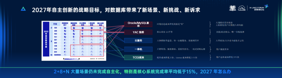 崖山从过去到现在和未来的产品技术发展,从来不是实验室中的想象,而是基于对市场和用户进行深入分析、应用中得到的真实诉求。左图是2023年信创市场进展的调研,其中有两个非常关键的信息:第一是2+8+N行业里信创总体的替代节奏和进展并不快;第二是在核心业务场景,这个比例相对于整体的节奏会更慢、更低。我们从各个行业里看到了新的场景、新的挑战、新的诉求,如对于商业和开源生态兼容性的普遍要求、政企和金融核心真正能够1:1平替集群的要求、大企业和大金融机构云平台建设对云上数据库能力的要求、自主化建设TCO成本的挑战等等。
