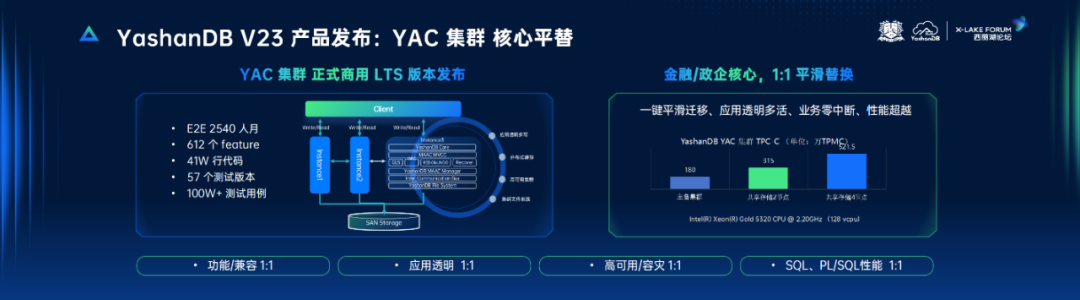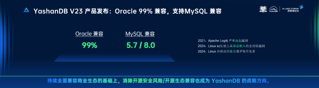 除了共享集群之外,V23版本在产品能力上也有了长足的进步,通过一年的努力,我们将Oracle的兼容性从90%提升到99%。在金融领域的市场客户场景中,基本可以做到应用零修改。同时我们也看到一些事件,包括Apache日志严重漏洞、Linux xz压缩工具恶意植入以及最近Linux的内核除名俄罗斯的开发者等,这也暴露了开源软件的漏洞和开源软件的供应风险问题。因此,今年我们与央行数研所、深圳政务云等战略客户合作,面向MySQL开源场景进行兼容性优化,在持续深化商业生态的同时,开源安全漏洞的消除和对开源生态的兼容也成为崖山新的战略方向之一。