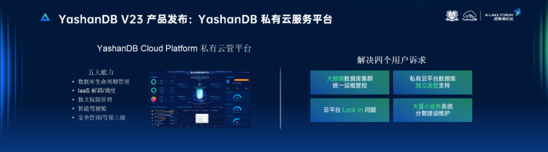 私有云技术已经在政企和金融等大企业广泛部署应用,但目前客户仍有大量对数据库的多样化需求。大部分数据库厂商的在云上的应用方案是在云上基于虚拟机部署和运维数据库,这会带来一个新的问题:云为用户带来的是统一运维、资源效率的优势,在云上又把它当作一台物理机去安装部署,这又把云的优势重新拉回了原点。因此基于私有云的场景,我们发布了基于私有云底座的崖山云管平台能力。崖山私有云基于私有云的IaaS提供统一的运维和服务支持,帮助用户解决云上大规模数据库集群的统一运维问题、私有云独立数据库选型难题、多云架构的切换问题以及小型且分散的系统统一建设的难题,帮助用户解决云上数据库选型和应用的痛点、并加强资源利用率和统一管理运维效率。