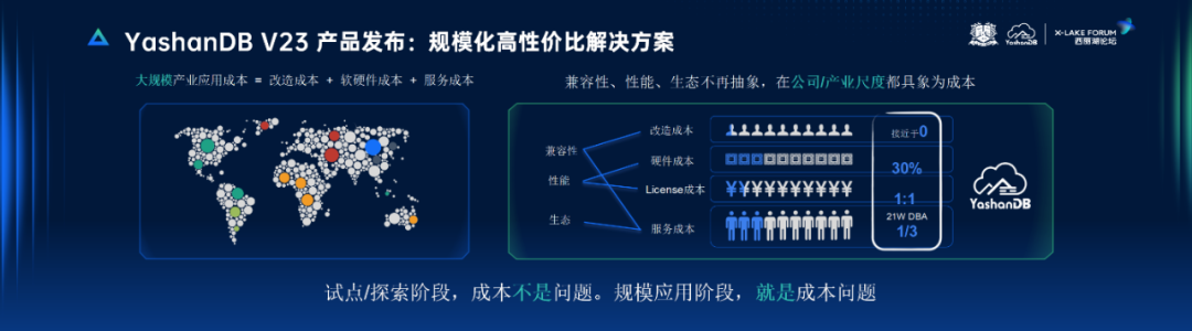 回到我们始终在讲的产业大规模应用问题,为了解决这个问题,崖山正式发布了高性价比的规模化平替解决方案。大规模产业应用的成本组成是多维度的,包含应用开发和改造成本、软硬件采购成本以及未来的服务成本。在单个项目或系统里,兼容性、性能、生态不是关键矛盾,但是放到公司、产业层面,这些都不再抽象,而是具象化为成本问题,兼容性影响应用开发和改造成本,性能影响硬件及软件的购买成本,生态则会影响未来长期的服务成本。