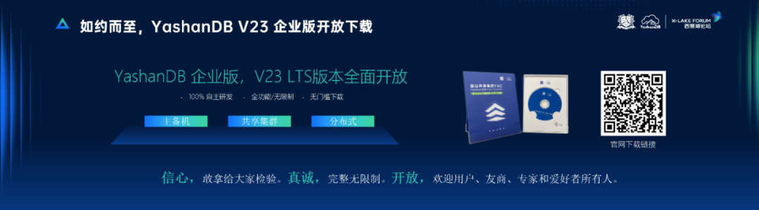 市场和用户是检验产品的真理手段,崖山在官网全面开放了V23 完整版本下载,主备机、共享集群、分布式产品形态毫无保留,完全开放下载。我们也是想向大家传递:首先,我们有信心,敢于把产品给所有人去检验、尝试、应用;第二,我们是真诚的,没有任何限制,开放下载的版本和企业级版本没有任何区别、没有任何约束和限制,所有人无需注册直接在官网下载;第三,我们是开放的,欢迎所有的用户、开发者使用产品,我们欢迎更多的建议、更欢迎更多的批评,用户的声音是我们未来努力的方向。