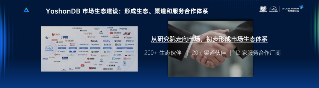 除了产品层面的发布,一款数据库在市场上商业应用成功,其市场生态非常重要。从研究院走向市场,我们也开始在生态、渠道和服务领域构建起能够支撑全国各区域、各行业的合作伙伴。截至目前,我们已经构建了200多个生态伙伴,在产业生态领域,与技术栈上下游的应用厂商、ISV厂商、中间件、操作系统以及硬件厂商深度适配;在市场渠道领域,已发展20多家全国各区域和各行业的渠道和代理商;同时除了原厂服务能力之外,和国内12家服务厂商达成了战略合作,以支撑未来崖山应用全面的技术服务支持。