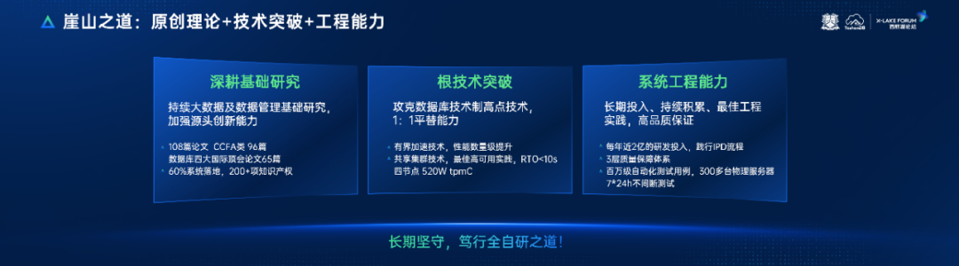 因此,崖山数据库团队采取“理论+工程”的创新模式,从创立以来就深耕基础理论研究和关键核心技术攻关,实现有界计算、近似计算、异步并行执行、跨模计算诸多原创理论突破,并将原创理论落地到产品研发中,目前有超过60%已经在系统中应用;工程团队专注每一行代码的自主研发,实现核心数据库产品的代码自主率100%,尤其是突破了共享集群这一塔尖技术,对核心系统规模应用有重要意义。凭借原始理论创新、内核全自研创新、大压力核心应用场景平替三大创新点,崖山数据库正向“国产数据库第一梯队”发起挑战。
