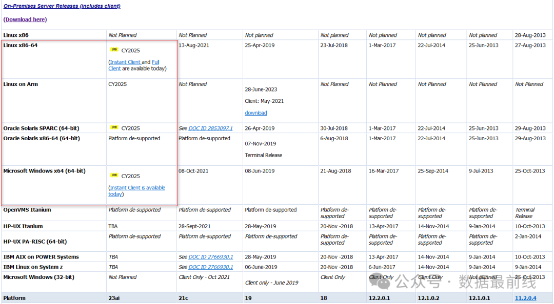 近日笔者在查看 Oracle 数据库版本策略时发现,Oracle MOS更新了版本发布文档 Doc. 742060.1,23ai OP 版的发布时间被推迟到 CY2025,也即是 2025年。