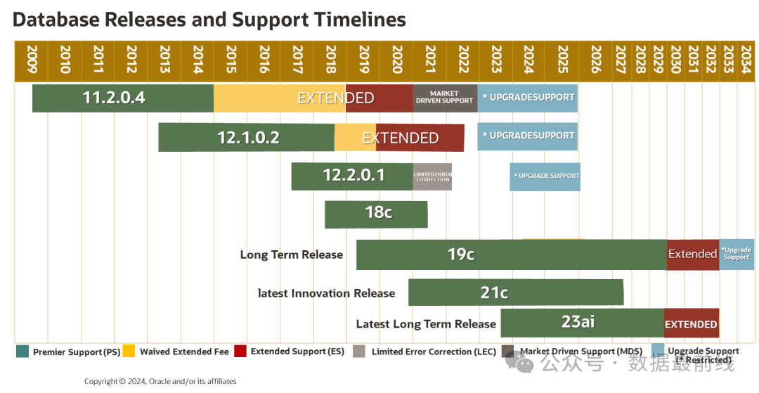 随着 23ai 的推迟,Oracle 也更新了 19c 的生命周期,标准服务时间延长到了 2029年12月31号,扩展服务周期则延长到了 2032年12月31号。