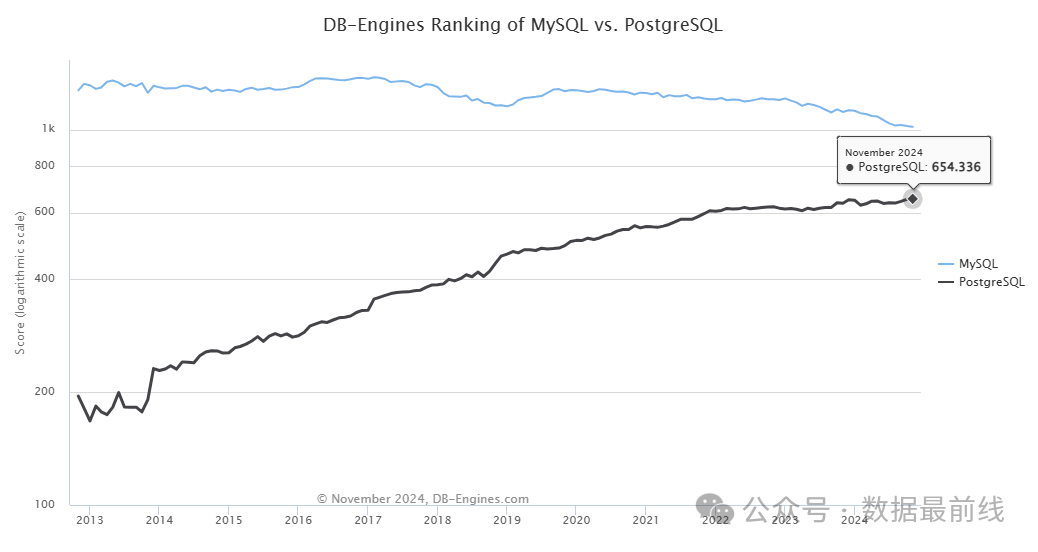 从上述DB-Engine数据库流行度趋势图中可以看出,虽然MySQL仍是最流行的开源数据库,但基本是处于缓慢下降的趋势中。反观PostgreSQL则表现出了强劲的上升势头,从2013年不到200已经上升到650+,而且近5年其上升趋势非常明显。那么是什么原因让MySQL逐渐掉队了呢?我们几个角度来分析。
