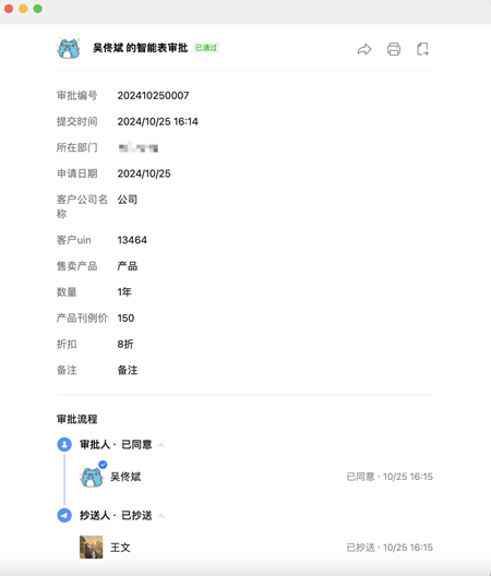 通过轻联iPaaS,企微智能表中的记录可以在企业微信中生成一张审批单据。审批通过后,审批结果将自动回写至企微智能表。这种无缝的集成大大简化了审批流程,提高了工作效率。
