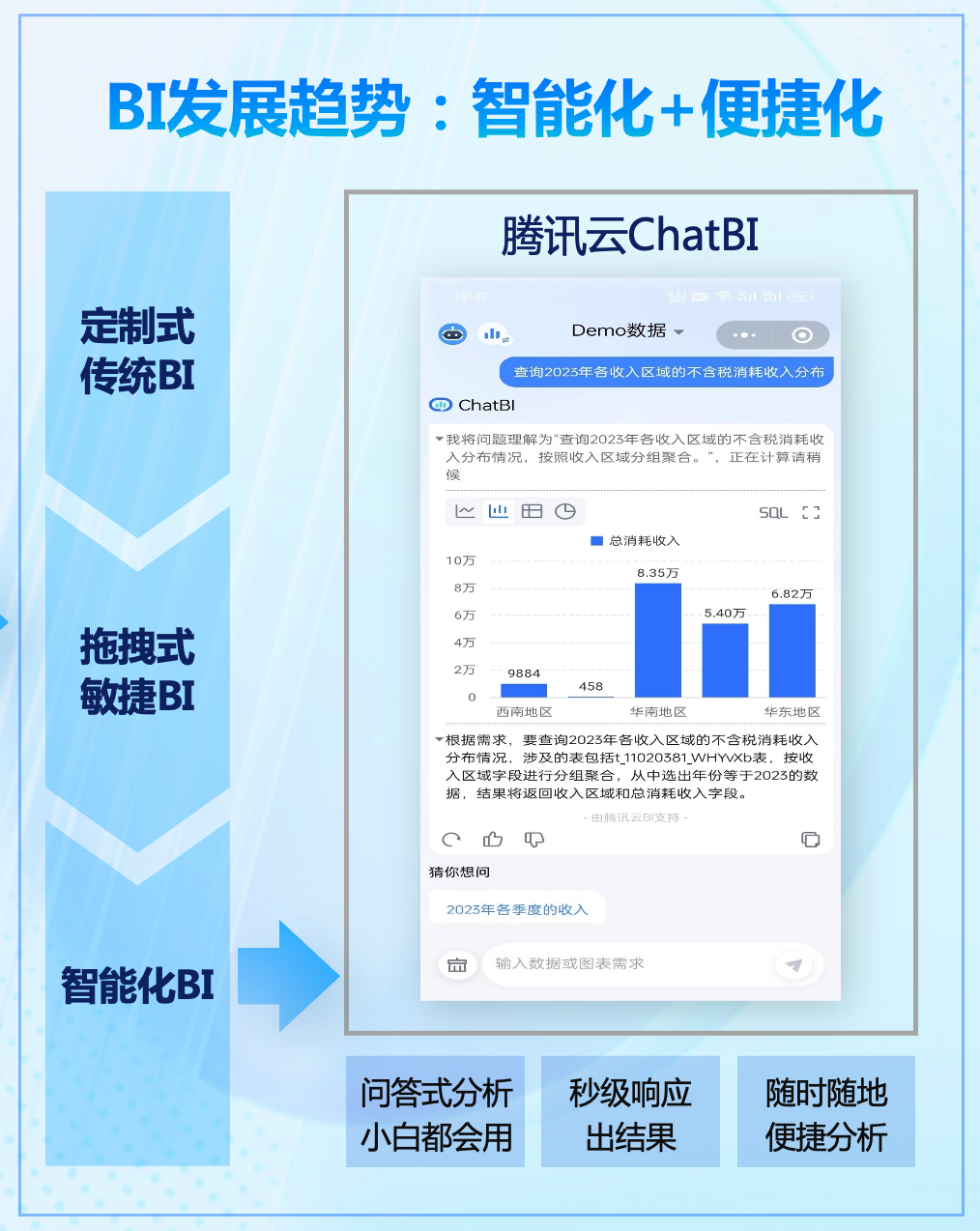 目前腾讯云ChatBI默认是使用Text2SQL的技术路线,使用大模型根据问题生成SQL。但是该路线具有以下天然的缺点:1.SQL模型在一些边界场景和复杂计算查询指令上,生成稳定性表现不佳;2.默认生成SQL方言是MySQL。如果用户使用的是其他数据源类型,目前ChatBI使用专门工具来转换,但是该工具对于方言的支持也比较有限,需要工程侧不断完善用例,维护成本较高。基于以上问题,我们也在Text2SQL上线后,调研并开发了Text2DSL的方案。Text2DSL不会直接让大模型生成SQL,而是生成一段我们定义好的DSL结构。DSL定义了特定于数据分析领域的语言和表达方式,这些专用语言可以帮忙大模型更好地理解和处理特定领域的数据和请求。Text2DSL路线除了能解决以上2个Text2SQL的缺点外,另外还有以下优点:1.与腾讯云BI的拖拽结构完全兼容,除了支持MySQL外,只要腾讯云BI支持的数据源,ChatBI都可以支持,新增数据源也是无感支持2.DSL生成的查询配置可以在BI控制台上继续进行二次编辑,并插入到指定的看板,固化为常用的看板查询分析。3.BI中有很多复杂的指标计算方式,比如区间同环比、组内排序等,最终下发到用户数据源的可能有多个查询SQL,Text2SQL就无法支持,但是Text2DSL可以天然无缝对接,因为DSL的定义可以更加的灵活,并兼容 BI 的查询协议。腾讯云ChatBI的DSL定义不仅参考了腾讯云BI的拖拽协议,也更多考虑了协议的通用性和大模型的理解能力。下面是协议的大的框架:具体协议内容篇幅过长,这里展示一个DSL 协议的demo示意,其对应的问题为“2024年消耗收入排名前5的客户及消耗”{