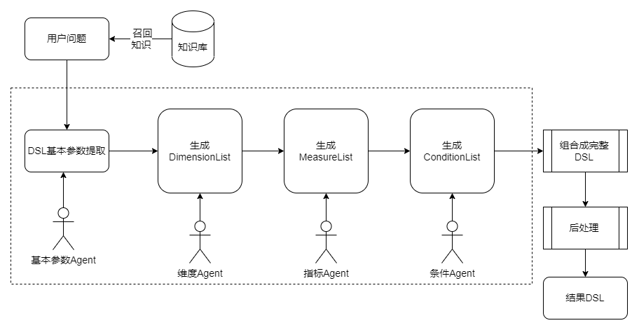 以上DSL协议其实很好理解的,为了获取2024年消耗收入排名前5的客户及其消耗收入,查询结果将限制显示前5名客户(`Limit`: 5),并可以通过表格或条形图的形式展示(`ChartType`: ["table", "bar"])。查询涉及的主要字段包括客户名称(`customer_name`)和消耗收入(`consumeincome`),其中消耗收入将进行求和处理(`Operator`: "sum")并按降序排列(`OrderBy`: "desc"),以便展示消耗最高的客户。此外,查询条件特定于2024年(`Year`: "2024")。区别于Text2SQL路线使用一个模型来生成SQL,在Text2DSL路线我们引入了Multi-agent的多模型架构。主要是考虑DSL包含众多字段,且各类型字段均遵循特定的操作规则,直接端到端生成DSL对模型会构成较大挑战。Multi-agent分为以下四个主要Agent:1. 基本参数获取Agent:为图表提取DSL的基本参数。2.维度字段DSL生成Agent:为维度字段列表生成详细的DSL配置。3. 指标字段DSL生成Agent:为指标字段列表生成详细的DSL配置。4. 条件字段DSL生成Agent:为条件字段列表生成详细的DSL配置。最后会整合DSL并验证准确性:将基本参数信息与维度、指标和条件信息列表综合,形成完整的DSL。此外,进行必要的后处理和正确性验证以确保DSL的准确性和有效性。3.ICL(In-Context Learning)调优即使是同一个问题,在不同业务场景和知识库下的结果也可能不同,因此需要对场景进行细分,但是传统的预训练和微调方法可能不足以应对快速变化的业务需求和数据环境。为了做到针对性的优化,我们引入了ICL调优。1.见效快:ICL允许模型在不直接训练的情况下,通过阅读上下文来适应新任务或数据,这样可以更快地适应新的业务场景。2.通过设计场景特定的提示(prompt),使模型能够在给定的上下文中学习和推理,从而提高答案的相关性和准确性。