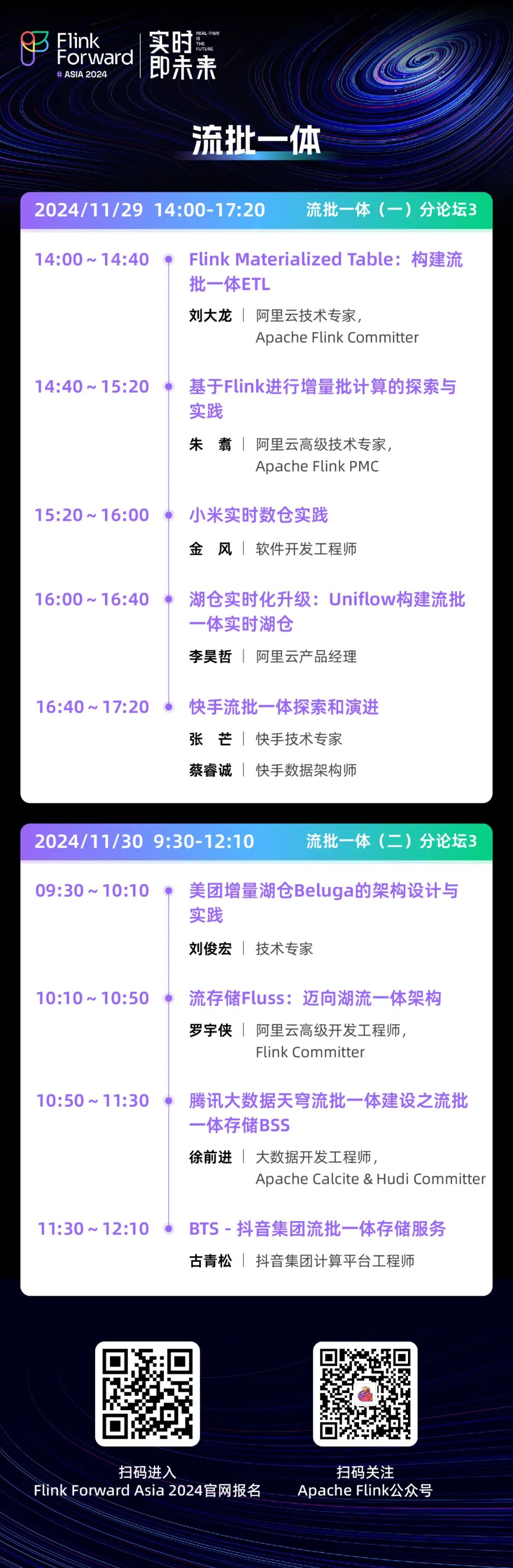 FFA 2024 流批一体专场由 Apache Flink 核心贡献者与来自阿里云智能、小米、快手、美团、腾讯及抖音集团公司的一线技术专家聚焦于流批一体的最新进展与实践,涵盖从理论探索到实际应用的全方位内容。围绕构建高效、统一的流批处理架构展开深入探讨。内容涵盖 Flink Materialized Table 统一流批 ETL、基于 Flink 的增量批计算探索、还覆盖了流批一体存储的应用实践等等。此外,还将分享多个实际案例,展示这些技术如何助力企业提升数据处理效率与灵活性。