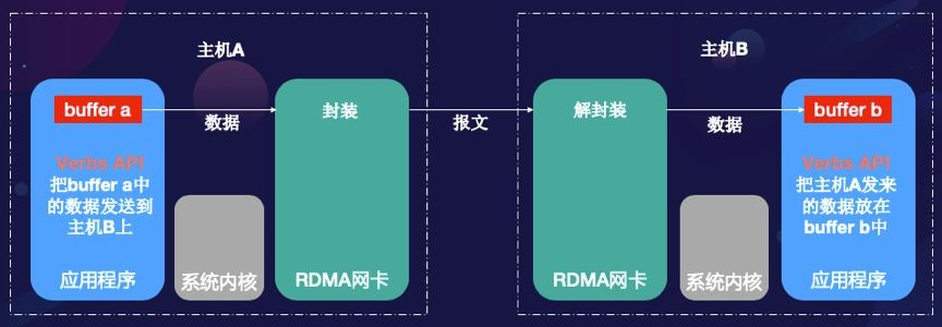 具体来讲,RDMA技术的应用要借助支持RDMA功能的网卡以及相应的驱动程序。由下图所示,一旦应用程序分配好资源,其可以直接把要发送的数据所在的内存地址和长度信息交给网卡。网卡从内存中拉取数据,由硬件完成报文封装,然后发送给对应的接收端。接收端收到RDMA报文后,直接由硬件解封装,取出数据后,直接放在应用程序预先指定的内存位置。