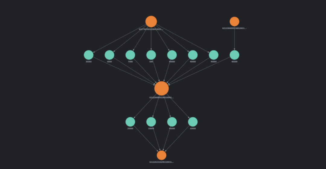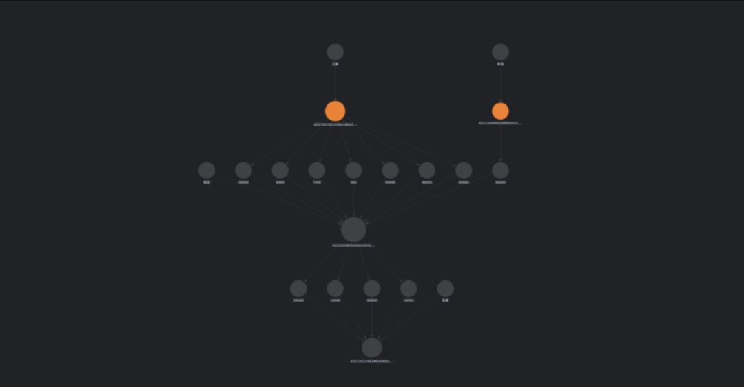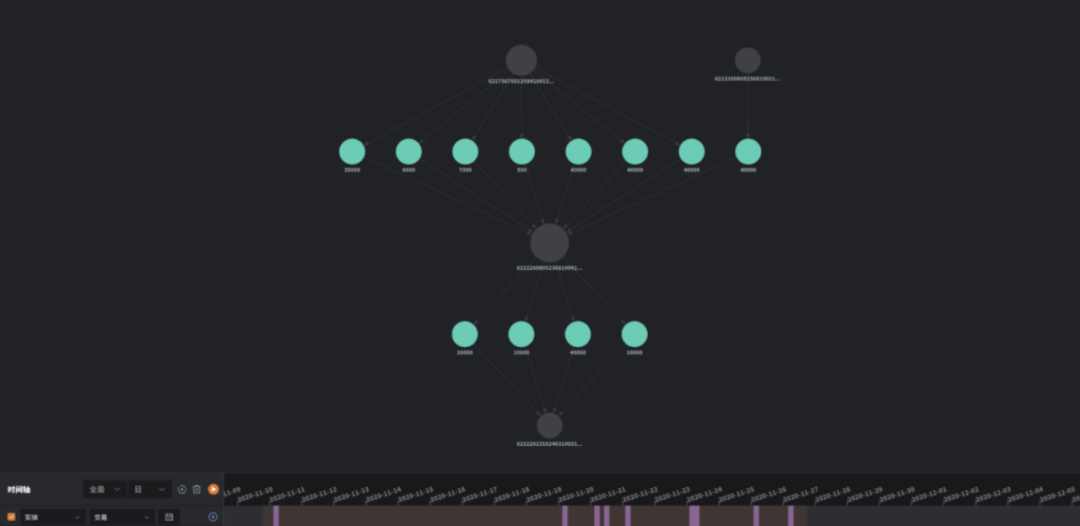 进一步分析探索,发现更多的异常账户和交易行为,而交易形态也逐渐形成交叉网络,均符合密集交易特征,并且呈现典型的“纺锤体”洗钱交易模式