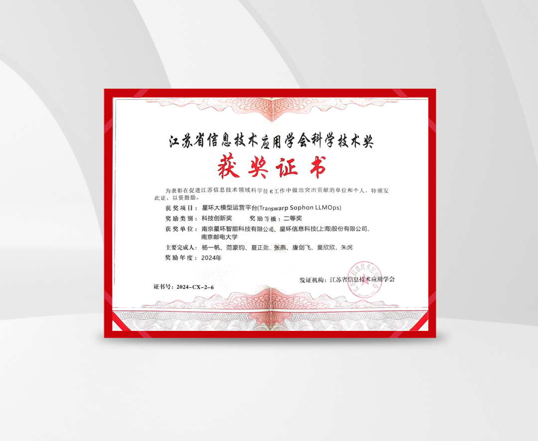 此次荣获江苏省信息技术应用学会科技创新奖二等奖,不仅是对星环科技Sophon LLMOps技术实力的认可,也是对其在推动大模型技术发展和应用方面所做贡献的肯定。星环科技将继续致力于为客户提供最先进、最效率、最便捷的AI解决方案,推动人工智能技术的发展和应用,为构建智能化的未来贡献力量。