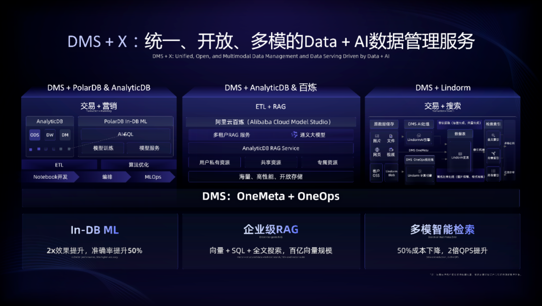 在今年9月的云栖大会上,阿里云瑶池数据库重磅发布“DMS+X:统一、开放、多模的Data+AI数据管理服务”。该平台通过OneMeta和OneOps两大创新,简化了数据管理与AI开发,实现DMS+X一站式的Data+AI全生命周期管理。在DMS+X之上,阿里云将助力企业数据以最快的速度拥抱AI,落地业务,产生价值。