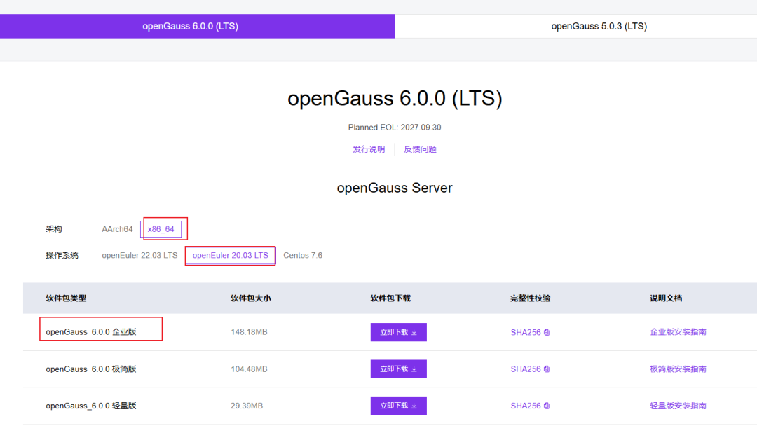 去 openGauss 官网下载对应系统的安装包,我这边的机器系统是 openEuler 20.03 LTS x86,下面我就以这个为例。