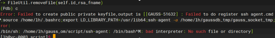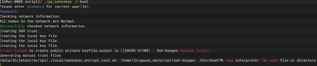 报错:Generating mutual trust files\n/data/lh/latest/script/./local/sshexkey_encrypt_tool.sh: /home/lh/gauss_om/script/ssh-keygen: /bin/bash^M: bad interpreter: No such file or directory