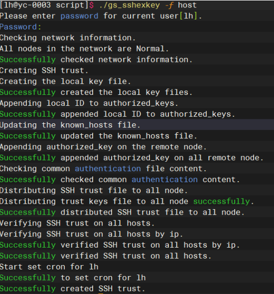 Parsing the configuration file.Successfully parsed the configuration file.Installing the tools on the local node.Successfully installed the tools on the local node.Creating SSH trust for [lh] user.Please enter password for current user[lh].Password:Checking network information.All nodes in the network are Normal.Successfully checked network information.Creating SSH trust.Creating the local key file.Successfully created the local key files.Appending local ID to authorized_keys.Successfully appended local ID to authorized_keys.Updating the known_hosts file.Successfully updated the known_hosts file.Appending authorized_key on the remote node.Successfully appended authorized_key on all remote node.Checking common authentication file content.Successfully checked common authentication content.Distributing SSH trust file to all node.Distributing trust keys file to all node successfully.Successfully distributed SSH trust file to all node.Verifying SSH trust on all hosts.Verifying SSH trust on all hosts by ip.Successfully verified SSH trust on all hosts by ip.Successfully verified SSH trust on all hosts.Start set cron for lhSuccessfully to set cron for lhSuccessfully created SSH trust.Successfully created SSH trust for [lh] user.Setting host ip envSuccessfully set host ip env.Distributing package.Begin to distribute package to tool path.Successfully distribute package to tool path.Begin to distribute package to package path.Successfully distribute package to package path.Successfully distributed package.Preparing SSH service.Successfully prepared SSH service.Installing the tools in the cluster.Successfully installed the tools in the cluster.Checking hostname mapping.Successfully checked hostname mapping.Checking OS software.Successfully check OS software.Checking OS version.Successfully checked OS version.Checking cpu instructions.Successfully checked cpu instructions.Creating cluster's path.Successfully created cluster's path.Set and check OS parameter.Set and check OS parameter completed.Preparing CRON service.Successfully prepared CRON service.Setting user environmental variables.Successfully set user environmental variables.Setting the dynamic link library.Successfully set the dynamic link library.Fixing server package owner.Setting finish flag.Successfully set finish flag.Preinstallation succeeded.