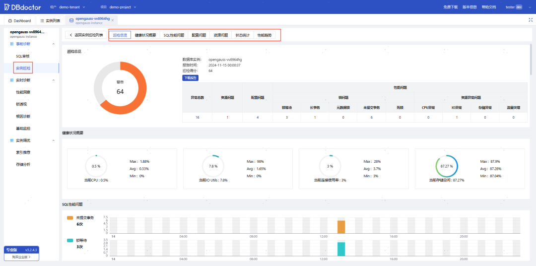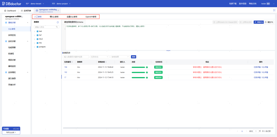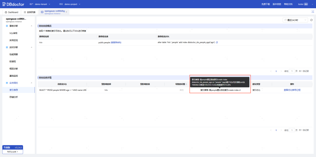 连通性检测通过后,点击提交后即可成功纳管openGauss数据库。在实例列表界面,可以看到已纳管的实例信息。 针对openGauss,DBdoctor提供哪些功能服务?当前DBdoctor 适配LTS版本:5.0、6.0,并提供SQL审核、实例巡检、性能洞察、锁透视、根因诊断、基础监控、索引推荐、存储分析等功能服务。一级功能 | 二级功能 | openGauss | 功能描述 |