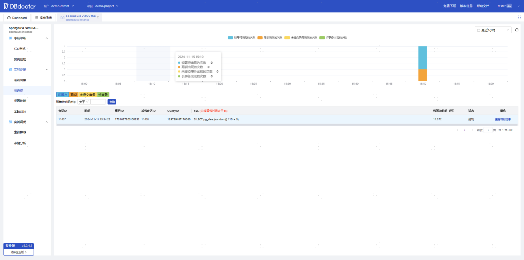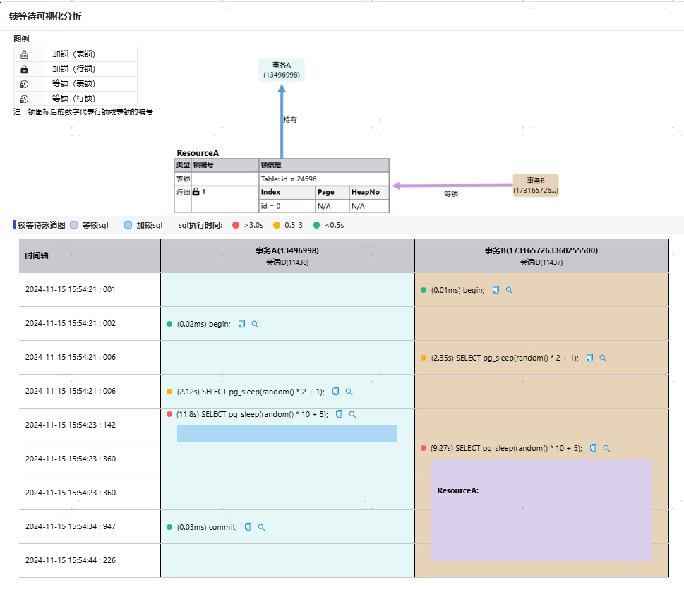 性能洞察界面中展示各资源使用率、业务流量以及数据库的平均活跃会话情况。基于数学模型精准定位,自动框选异常时间区间并提示根因SQL,单条SQL资源可量化,把资源消耗映射为颜色面积,直观定位数据库性能问题并给出优化建议。锁透视界面涵盖锁等待、死锁、长事务、未提交事务四大锁场景,点击查看等锁信息,即可通过环形图和泳道图方式直观的慢动作回放事务SQL的完整执行过程,并按照事务执行时序高亮标识数据库内核详细加锁和等锁事件,慢动作回放问题现场,快速找到问题源头。