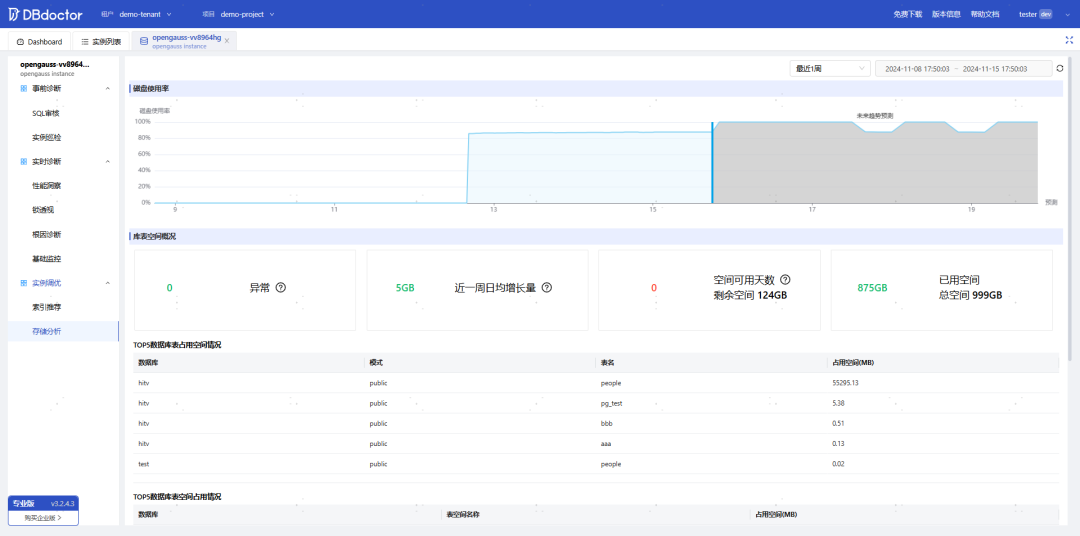 通过存储分析功能可以直观地查看某个数据库实例的存储使用概况、未来使用趋势预测。可以查看数据库中出现存储异常情况,以及对应的问题分析及修复建议。免费下载 一键部署:https://www.dbdoctor.cn/?utm=14