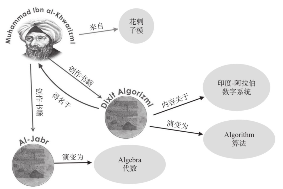 现代意义上我们所说的算法,其完整语义到19世纪才完全形成。图1用最简洁且脉络化的方式给读者呈现了“算法”一词的由来。