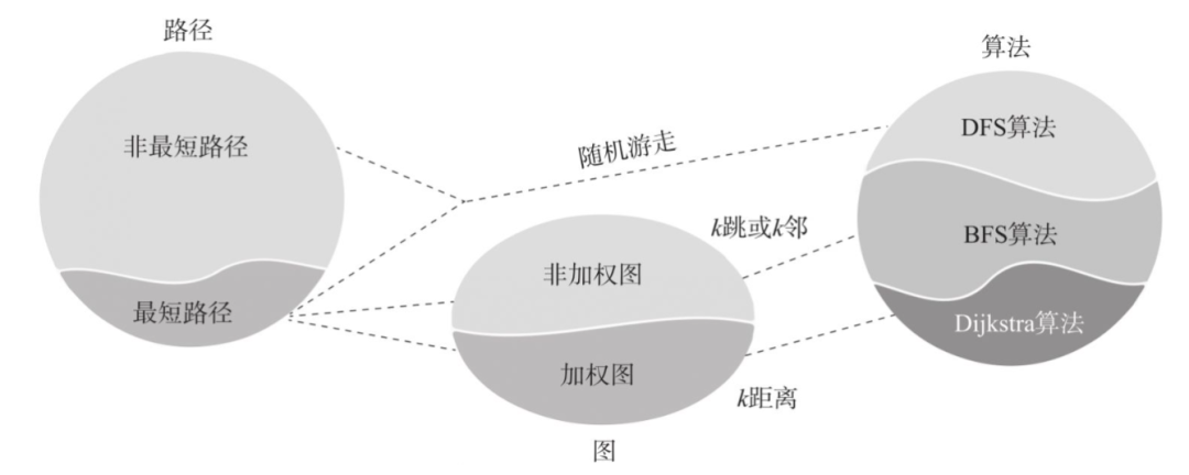 关于图算法的分类,业界并没有严格意义上的共识。有的侧重于学术研究的图计算框架,甚至会把广度优先搜索(BFS)或深度优先搜索(DFS)作为算法单列,尽管它们更适合作为一种图遍历模式存在。还有的如最短路径算法,在20世纪计算机发展的前30年间(20世纪40年代至70年代),最短路径算法不断推陈出新,对于计算机体系架构的发展有相当大的推动作用。图2示意了一种典型的在图上寻路所对应的算法分类情况。