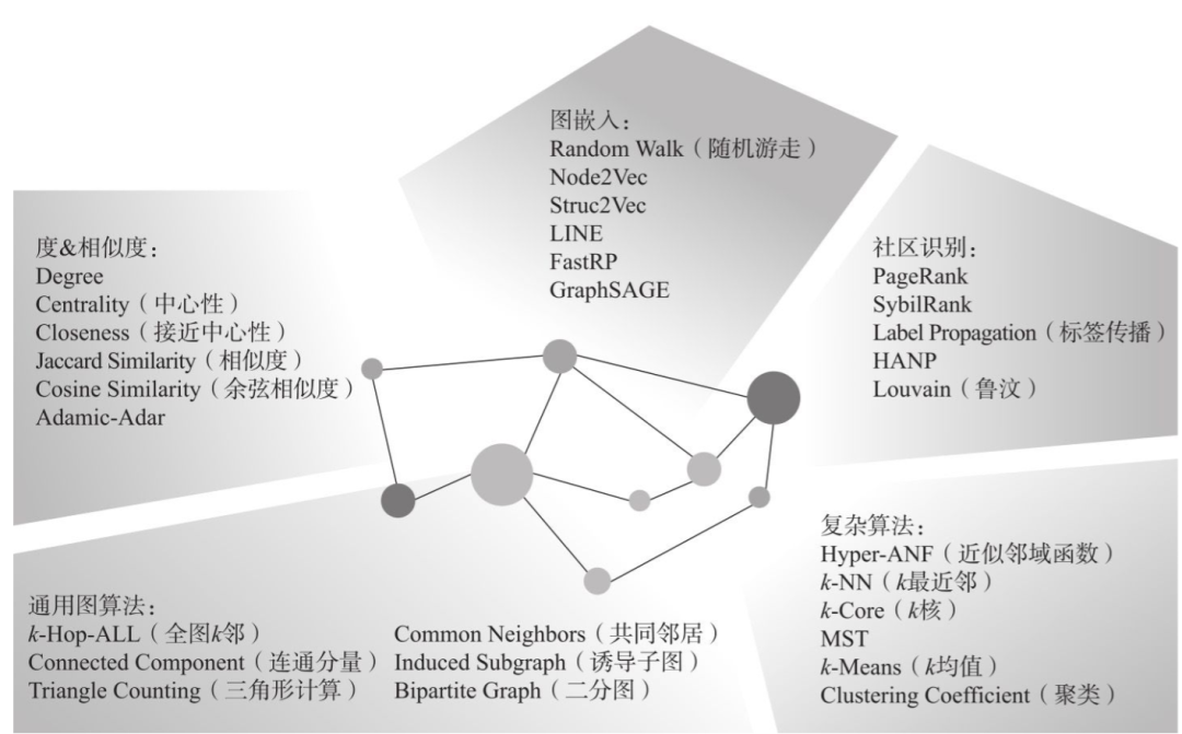 ❑数值分析。数值分析在本质上是一种数值化近似方式的算法,通过量化的方式来加速求解,比如,保险行业精算师的主要工作就是进行数值分析,以及金融业中的存贷款定价、风险量化分析等操作,都可以通过数值分析类算法来实现。而通过巧妙设计的图算法,可以让这些数值分析的准确度、效率与可解释性都远超之前基于机器学习、深度学习的方法。工业界的图数据库厂商可能还会有不同的分类方法,图3所示也是一种算法分类(5类)。