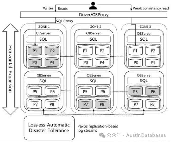 2.2 OceanBase 1.0 至 3.0 为解决OceanBase在0.5中遇到的问题,OceanBase 放弃了先前的架构,开发了 1.0 至 3.0 版本,特点完全对等(P2P)结构。每个 OBServer 包含 SQL、存储和事务引擎。所有服务器除了能够同时存储数据外,还能够处理 SQL 和处理事务。垂直方向代表分布式可扩展层,而水平方向代表复制层。水平方向提供高可用性能力,而垂直方向通过不断添加机器来增强服务的整体可扩展性,这里采用了几种优化来实现低延迟。在独立模式下,本地执行计划、本地事务 API 以及消除读写操作中的网络开销实现低延迟。在分布式模式下,使用重复表并行执行引擎和多个分区索引,通过这些方法实现低延迟性能的关键因素。