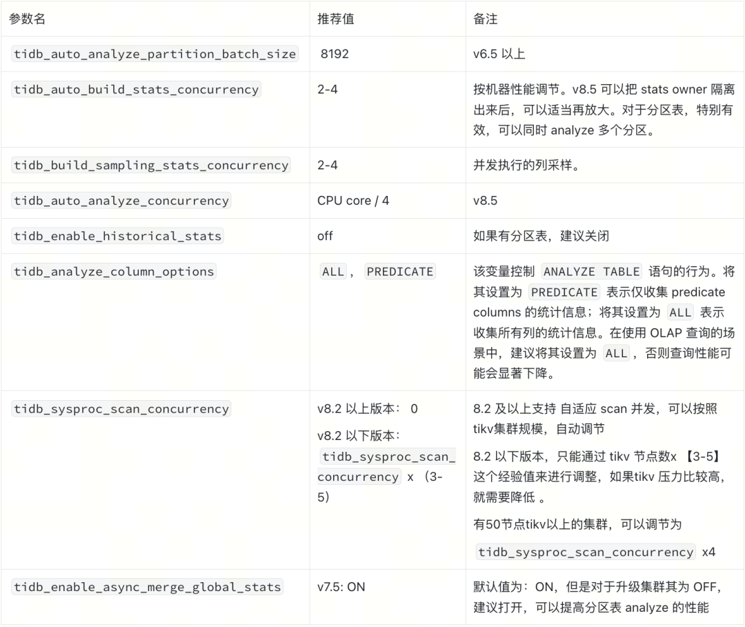 4. v8.5 及以上版本:tidb_auto_build_stats_concurrency、tidb_build_sampling_stats_concurrency 与 tidb_auto_analyze_concurrency 三个参数的乘积不应超过 CPU 核心数,以保持系统的稳定运行。通过合理调整这些参数,可以优化 TiDB 的统计信息构建和采样过程,提高 Analyze 任务的效率,同时确保不会过度占用系统资源。