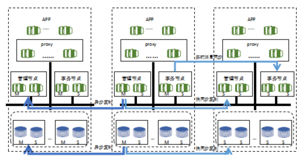 1.分集群部署,主机房和异地灾备机房均是星形结构复制,两个机房间数据节点使用采用异步复制;