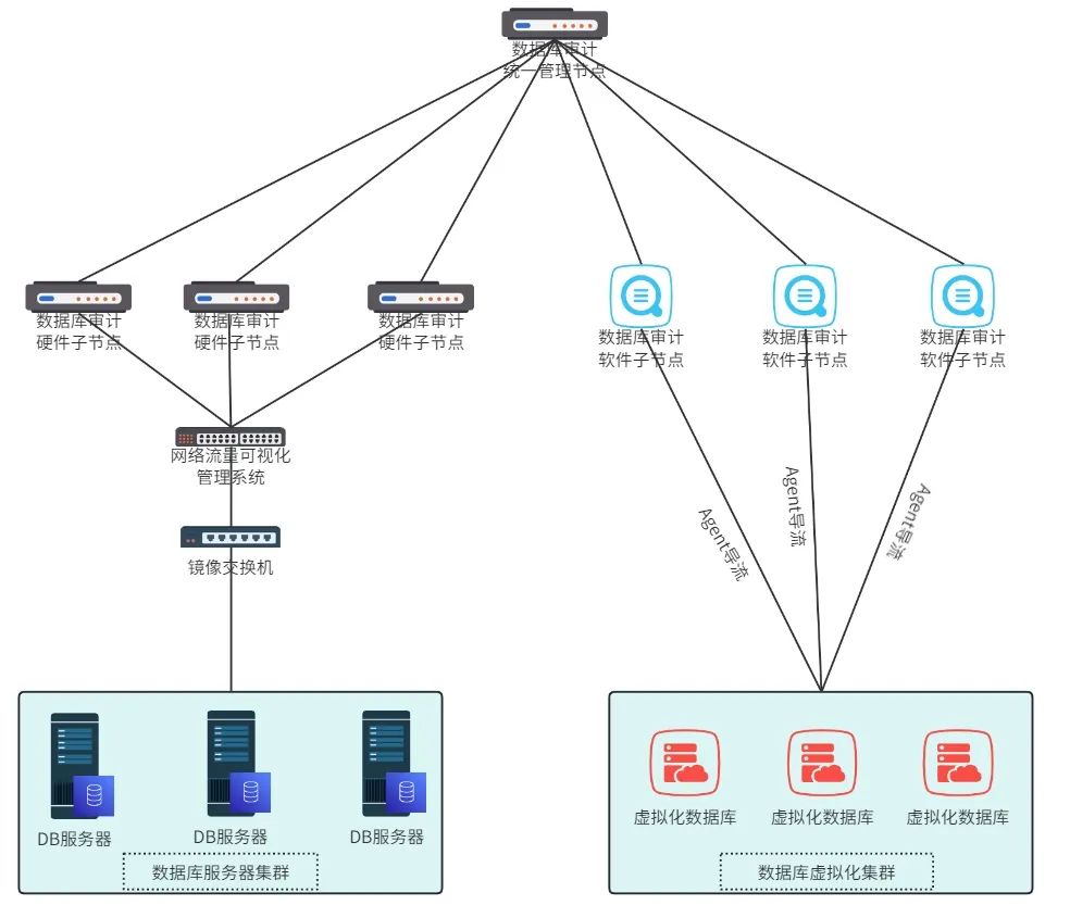 基于客户整体的流量与环境背景,启明星辰数据库审计大流量场景下的解决方案从硬件与软件进行双重部署:一是硬件部署方案结合网络流量可视化管理系统,有效应对大流量数据库访问的审计需求,确保在高并发、大数据量的场景下,依然能够保持审计的精准度与实时性;二是虚拟化中数据库东西向访问的审计场景,数据库审计软件和导流插件方案,深入虚拟化架构内部,实现对数据库访问行为的全面监控与审计,有效解决客户提出的风险和需求问题。具体表现如下: