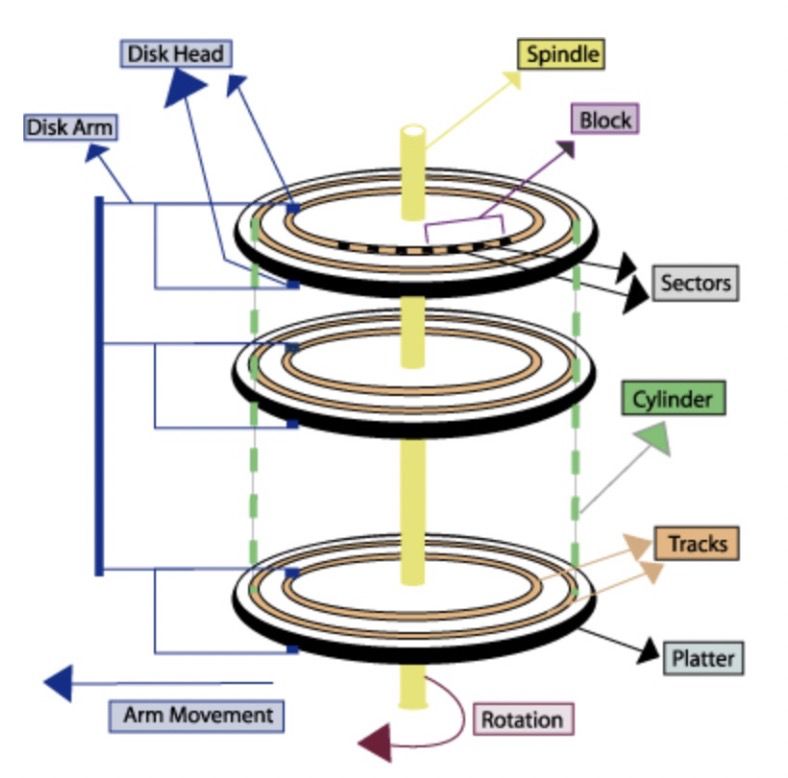 整个过程主要有三部分时间消耗:查找时间(seek time) 、等待时间(latency time)、传输时间(transmission time) ,分别表示定位柱面的耗时、将块号指定磁道段移到磁头的耗时、将数据传到内存的耗时。