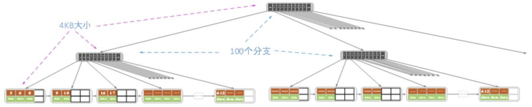 假设,我们现在选择4KB作为内存和磁盘之间的传输单位,那么我们在设计B+树的时候,不论是索引结点还是叶子结点都使用4KB作为结点的大小。假设一个记录的大小是1KB,那么一个叶子结点可以存4个记录。而对于索引结点(大小也是4KB),由于只需要存key值和相应的指针,所以一个索引结点可能可以存储100~150个分支,所以整棵树大概可以存储400万个记录: