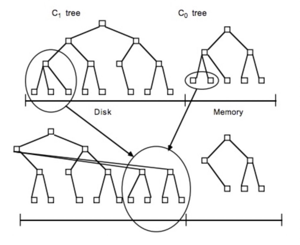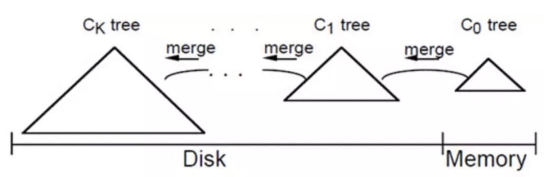 当C0大小达到某一阈值时或者每隔一段时间,将C0中记录滚动合并到磁盘C1中;对于多个存储结构的情况,当C1体量越来越大就向C2合并,以此类推,一直往上合并Ck。
