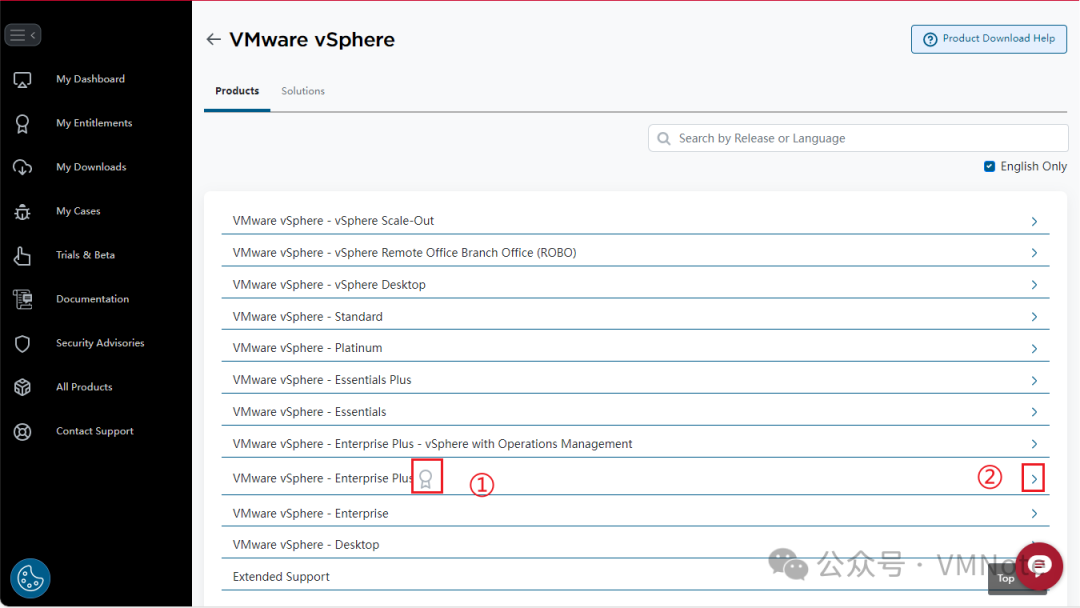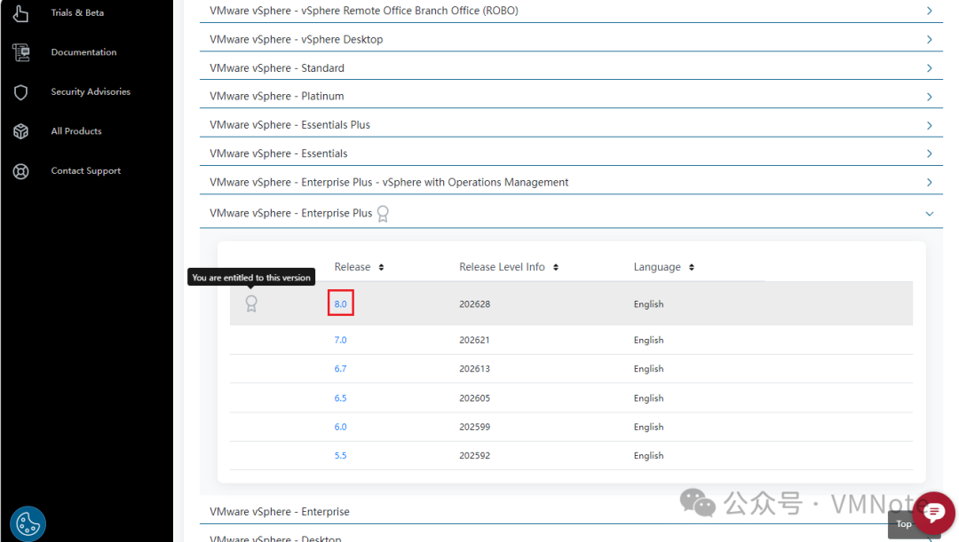 第4步,在vSphere下载页面,选择包含授权徽标的产品,然点击右边的尖括号展开页面