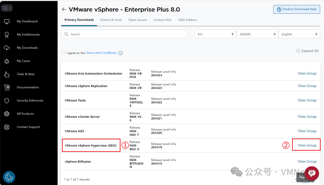 第6步,在vSphere下载页面,找到ESXi所在的行,然后点击【View Group】