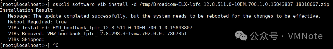 [root@localhost:~] esxcli software vib install -d /tmp/Broadcom-ELX-lpfc_12.8.511.0-1OEM.700.1.0.15843807_18018667.zipIntallation ResultMessage: The update completed successfully, but the system need to be rebooted for the changes to be effective.Reboot Required: trueVIBs Installed: EMU_bootbank_lpfc_12.8.511.0-1OEM.700.1.0.15843807VIBs Removed: VMW_bootbank_lpfc_12.8.298.3-1vmw.702.0.0.17867351VIBs Skipped:[root@localhost:~]