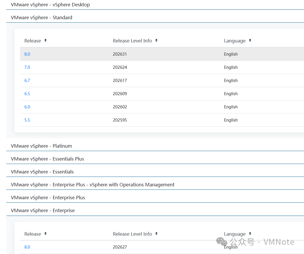 无论通过何种许可类型下载的 VMware vSphere 安装镜像都一样。若是下载 OEM 的 ESXi 镜像,任意许可类型下均可以下载。但是,若要下载 vCenter Server 镜像,则需依据客户所购买的许可类型进行操作。例如,若客户当前购买的是 VMware vSphere - Enterprise,便只能在该许可类型下下载,若选择 vSphere - Standard 进行下载将会提示无权限。要确认是否具有下载权限,可以查看许可类型后是否有相应权限的徽标。