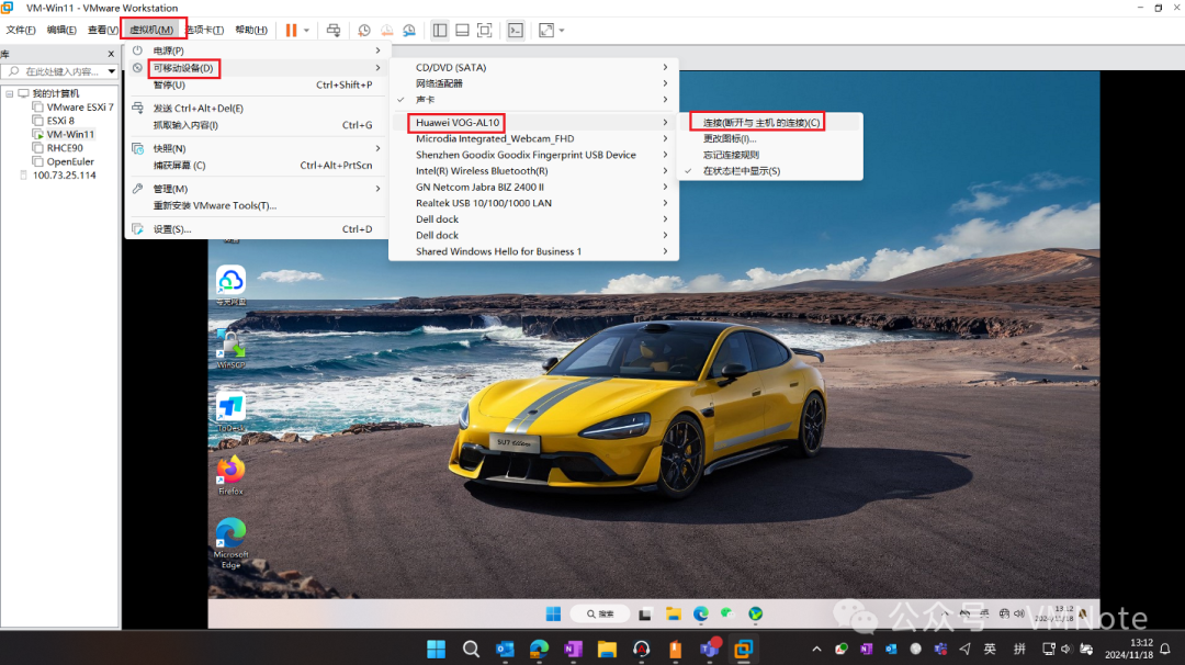 第4步,点击VMware Workstation上的“虚拟机”->"可移动设备",找到你的手机,然后点击连接