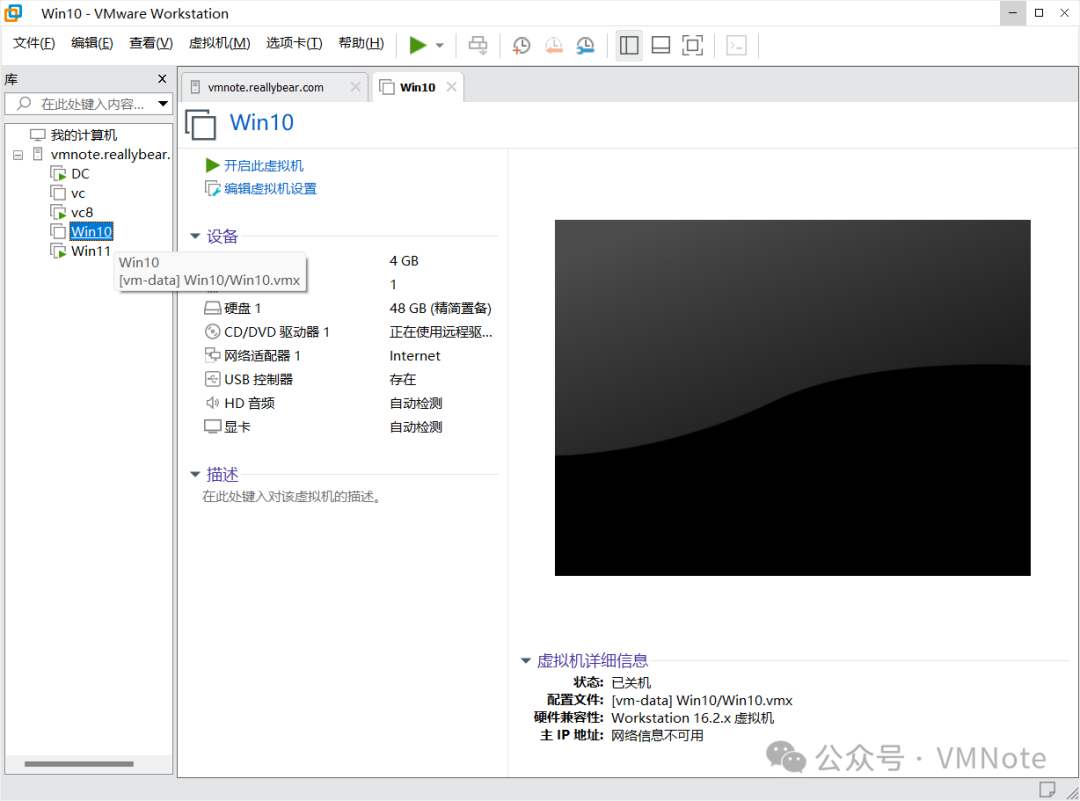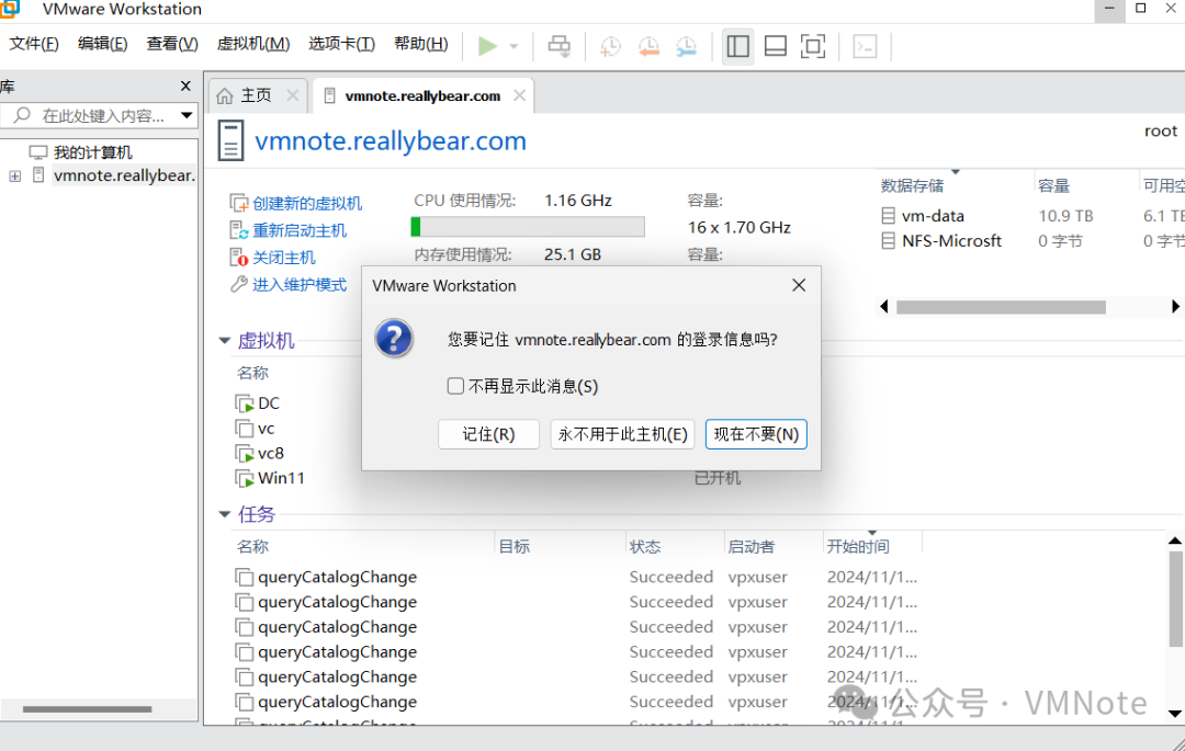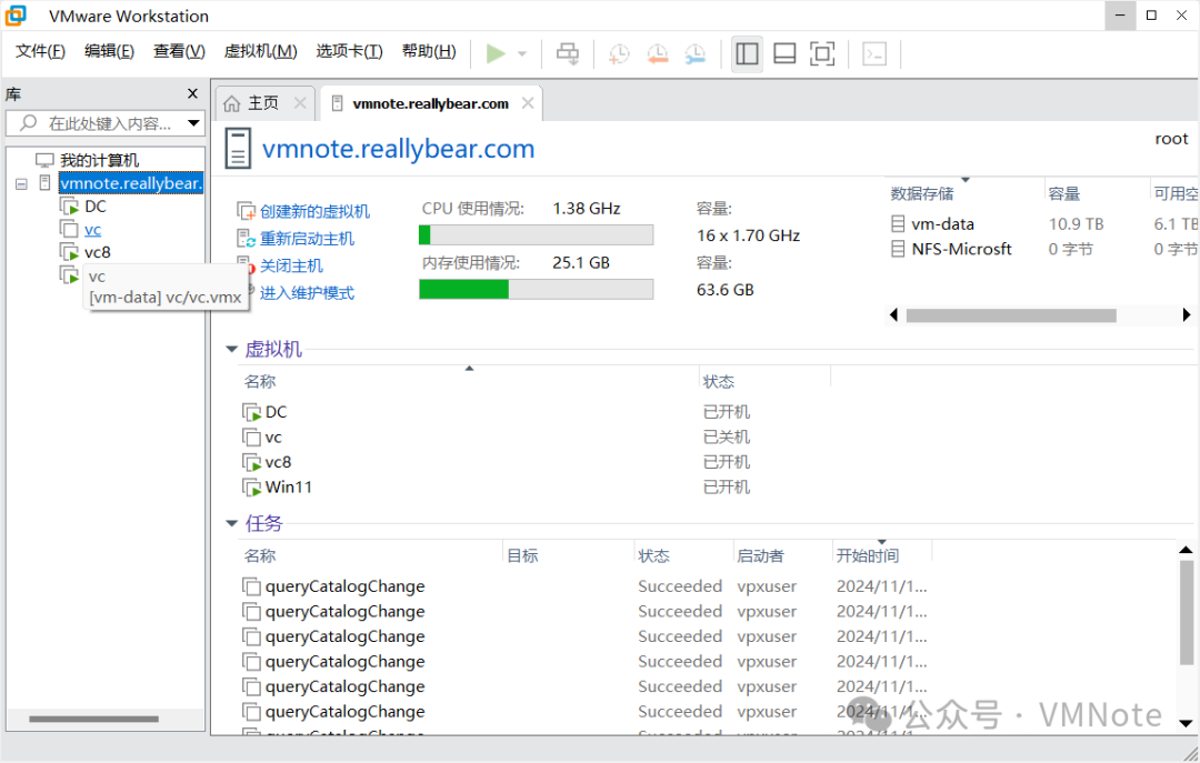第6步,确认VMware Workstation左边的视窗中已经列出了远程ESXi主机上的所有虚拟机