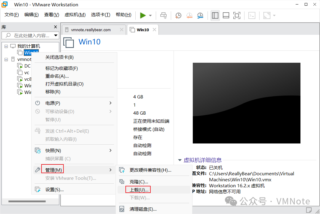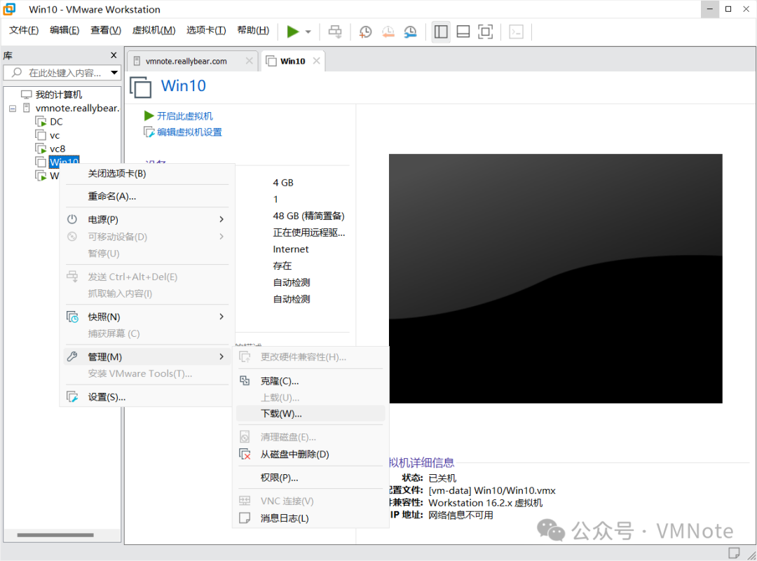 第2步,选择虚拟机,然后点击右键,选择 管理 -> 下载