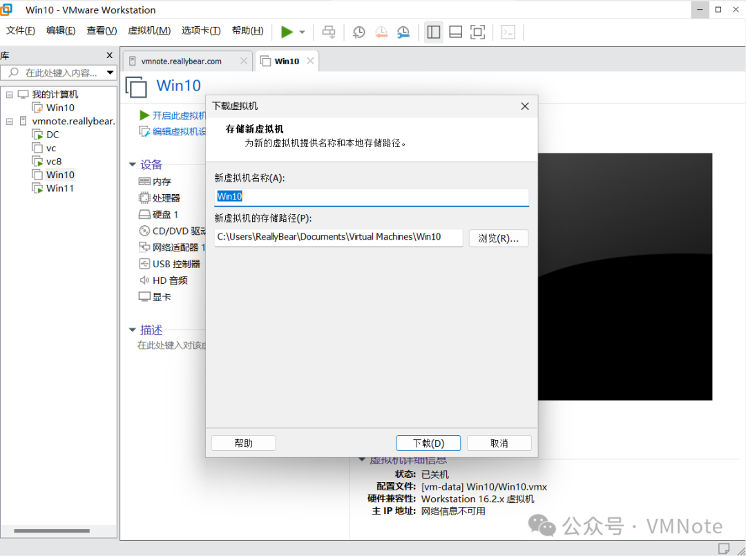 第3步,在弹出的下载虚拟机页面,根据实际情况选择是否修改虚拟机的名称和保存的路径,然后点击 下载