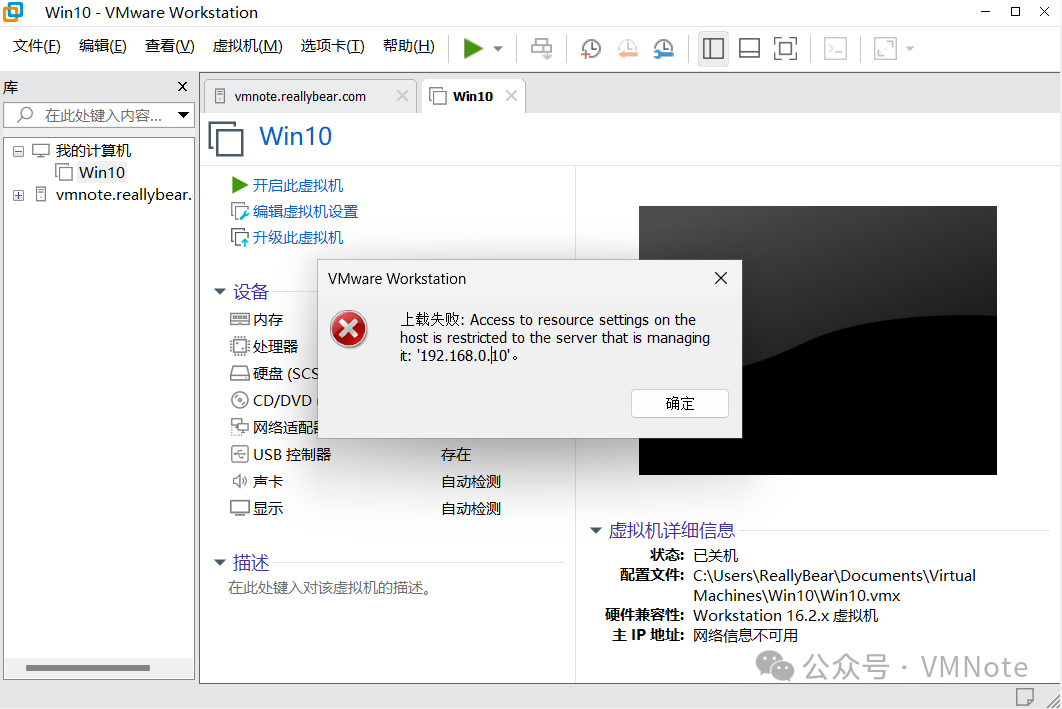 根本原因:该ESXi主机受vCenter Server 管理,无法直接通过ESXi上传虚拟机