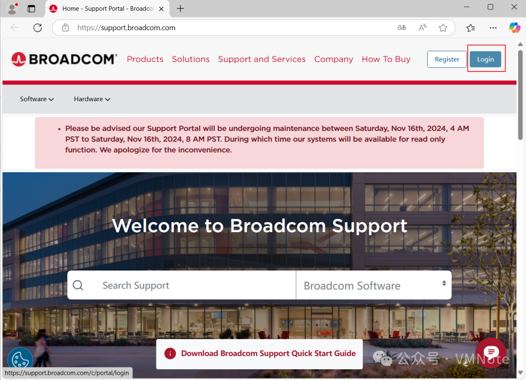 第1步,访问博通支持主页,并点击右上角的 Login(登录)按钮。