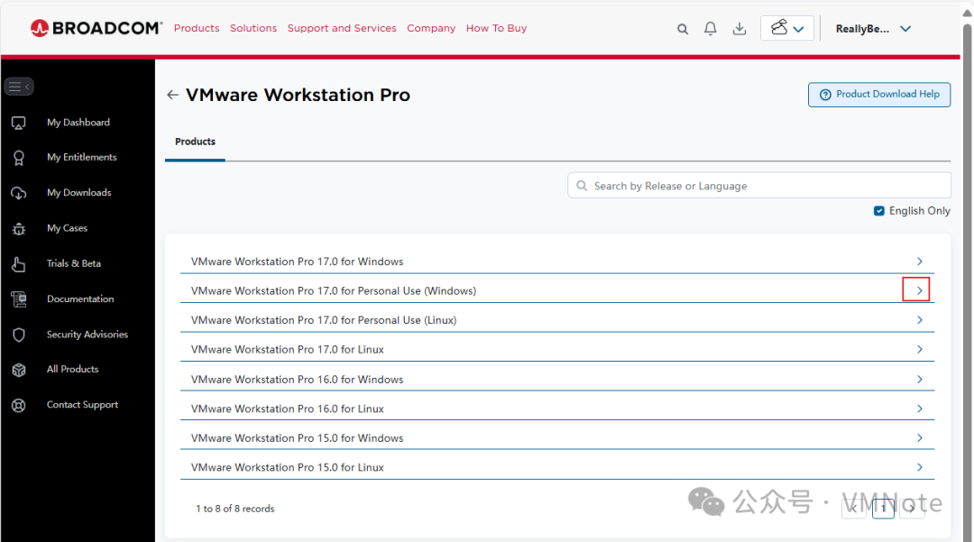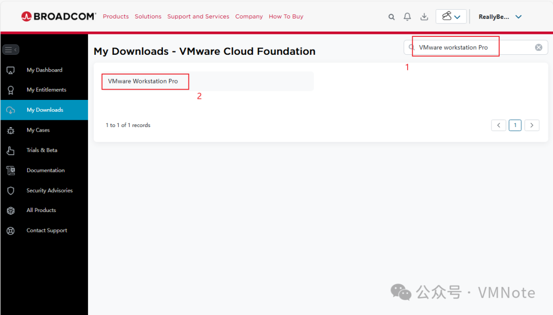 第5步,在 My Download 页面的右上角输入框中输入关键字“VMware Wokstation Pro”,然后在结果列表里面点击 VMware Workstation Pro