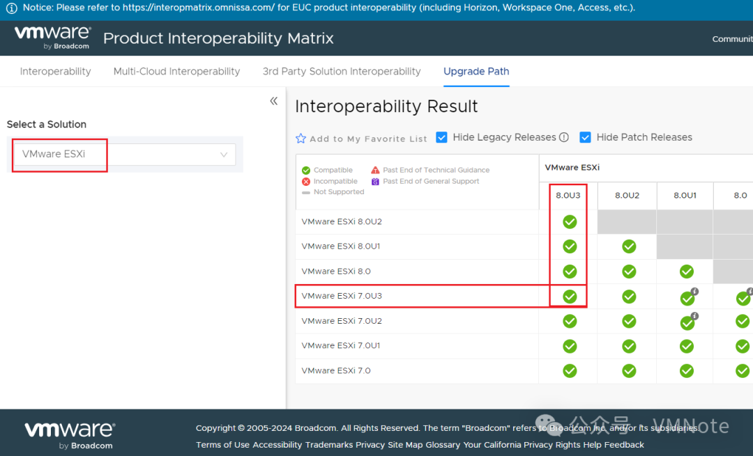 第2步,访问 VMware 产品互操作性列表(https://sim.esp.spespg1.vmw.saas.broadcom.com/Upgrade?productId=1),确保从ESXi当前版本(即 ESXi 7.0U3)升级至目标版本(ESXi 8.0U3)的路径是受支持。