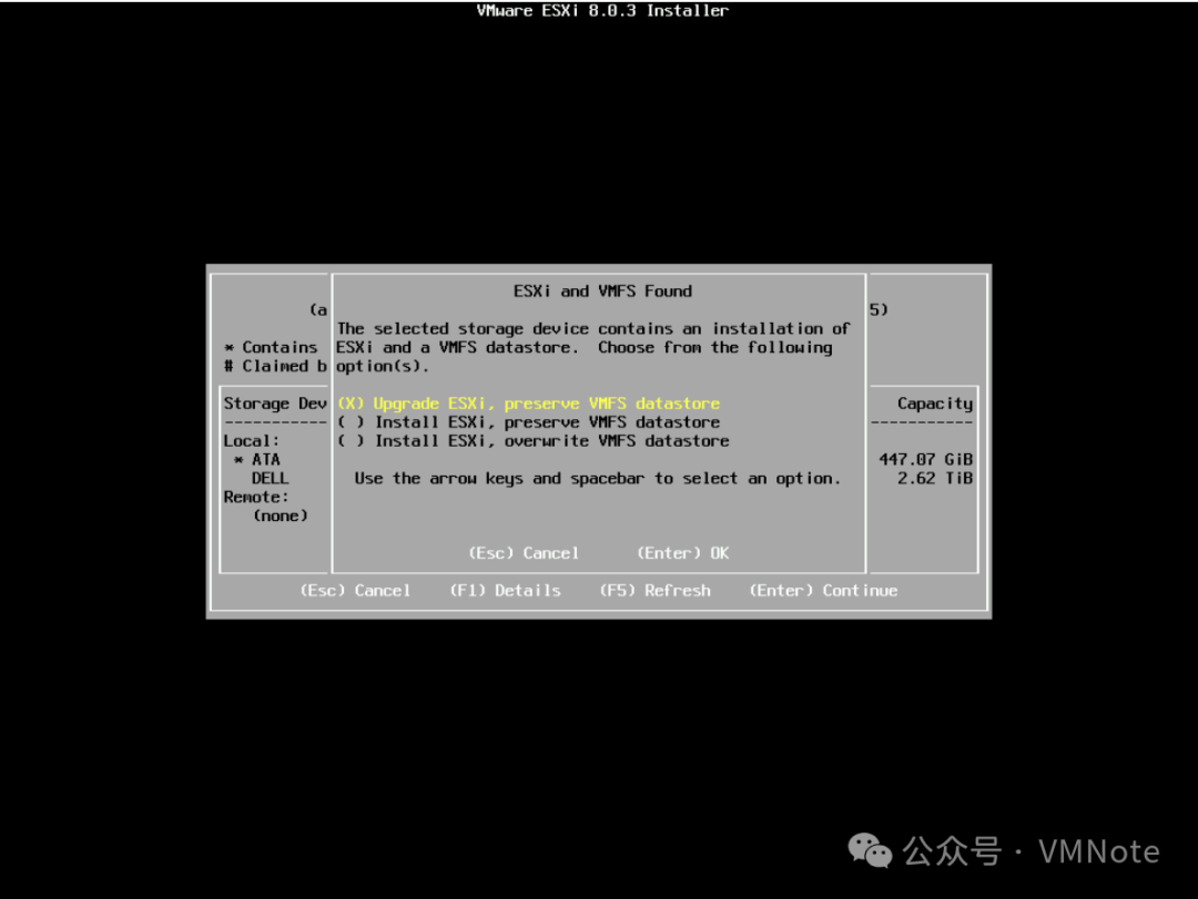 注意:这步也很重要,一定不能选错,因为后面两个是针对重装ESXi的选项
