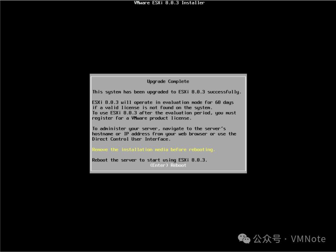 第11步,升级成功,根据提示移除安装介质,并按 Enter 键 重启ESXi主机
