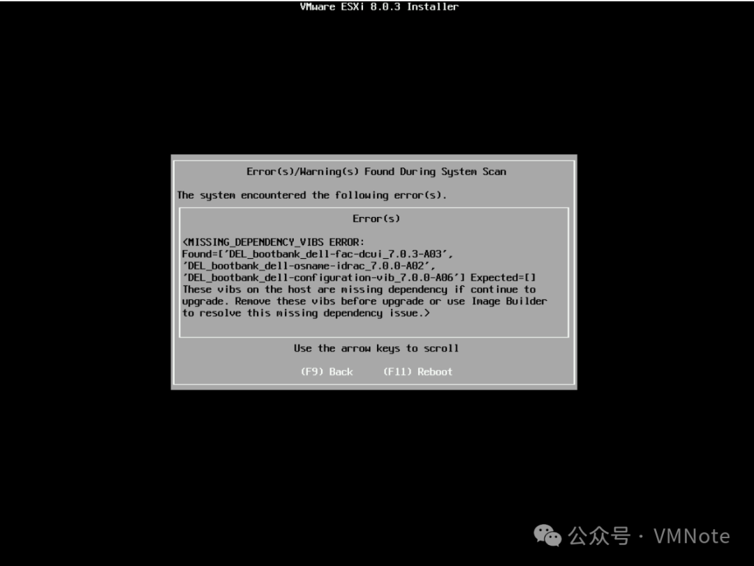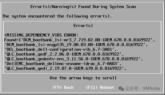 根本原因:当前ESXi上安装的一些VIB软件不兼容新版ESXi。
